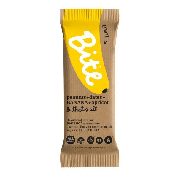 В Bite спорт входят такие компоненты, как абрикосы, финики, бананы и арахис. Всем известно, что банан - полезный фрукт. Это хороший источник витаминов и, помимо всего, банан это натуральный антидепрессант. Его мякоть помогает организму выделять серотонин - гормон радости. Абрикос полезен тем, у кого есть проблемы с сердцем и желудком. Считается, что финики укрепляют здоровье и продлевают жизнь. Они помогают восстановить силы при физической усталости, переутомлении. Арахис - питательный и очень полезный орех. Он богат питательными веществами. Он благотворно действует на иммунитет, помогает организму бороться с инфекцией и стрессом, поднимает настроение и избавляет от депрессии.