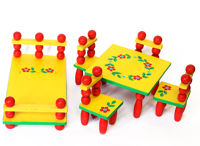 Деревянная расписная кукольная мебель, всего шесть предметов: кровать, стол, 4 стула. Высота кровати 10 см., а длина 27 см., высота стула - 12,5 см. Долговечная и оригинальная игрушка. Климовские игрушечники используют здесь свой излюбленный прием: деревянные шарики на спинках стульчиков и кровати соединены прочным резиновым шнурком, т.е. подвижны. Кукольная мебель необходимый атрибут для детских игр, условие успешного освоения ребенком социальных ролей.