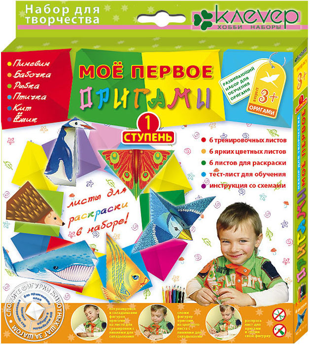 Комплектация: 6 трениров0чных листов, 6 цветных листов, 6 листов для раскраски – все листы с пунктирными линиями для облегчения складывания,1 тест-лист для обучения оригами, книжка-инструкция